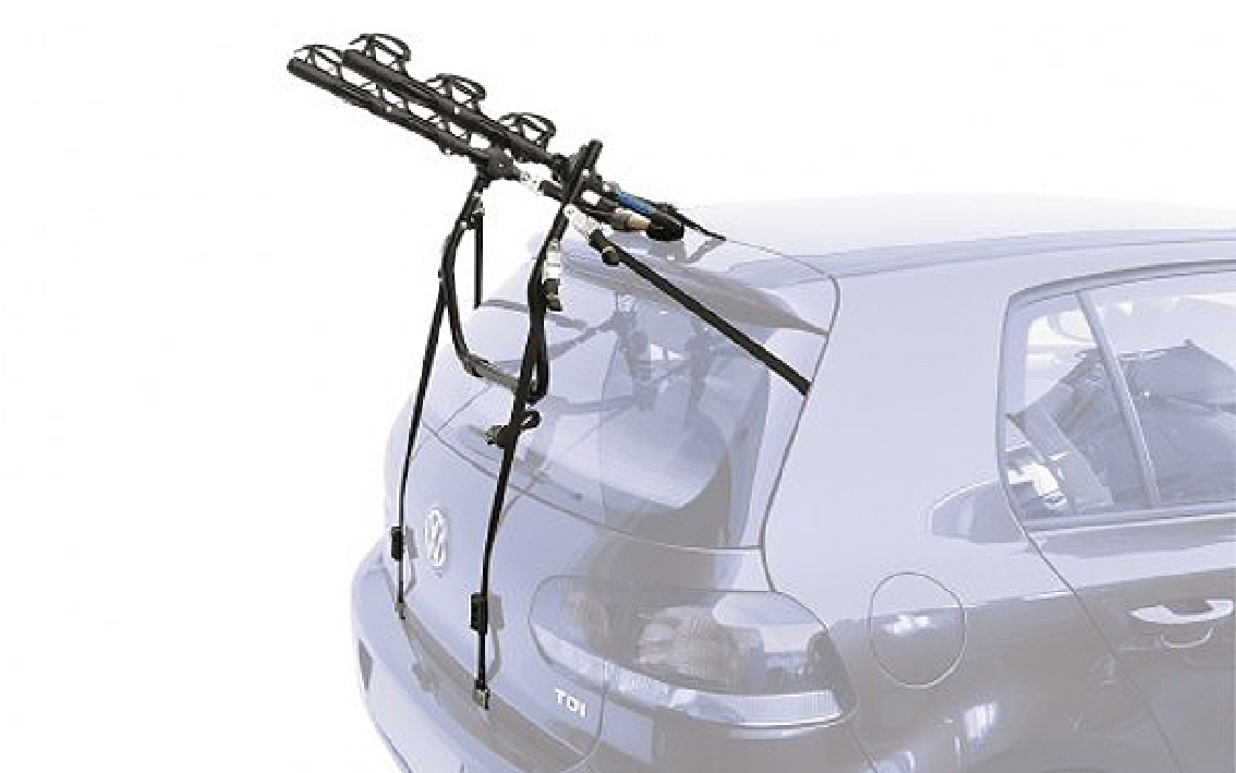 steel, 3 bikes max 29″, max load 3 x 15 kg, double upper straps, lower straps anti-bounce system, all 6 straps tested at 250 kg each, all 6 hooks tested at 350 kg each, quick and easy to fit and remove, folds flat for storage, 4.2 kg