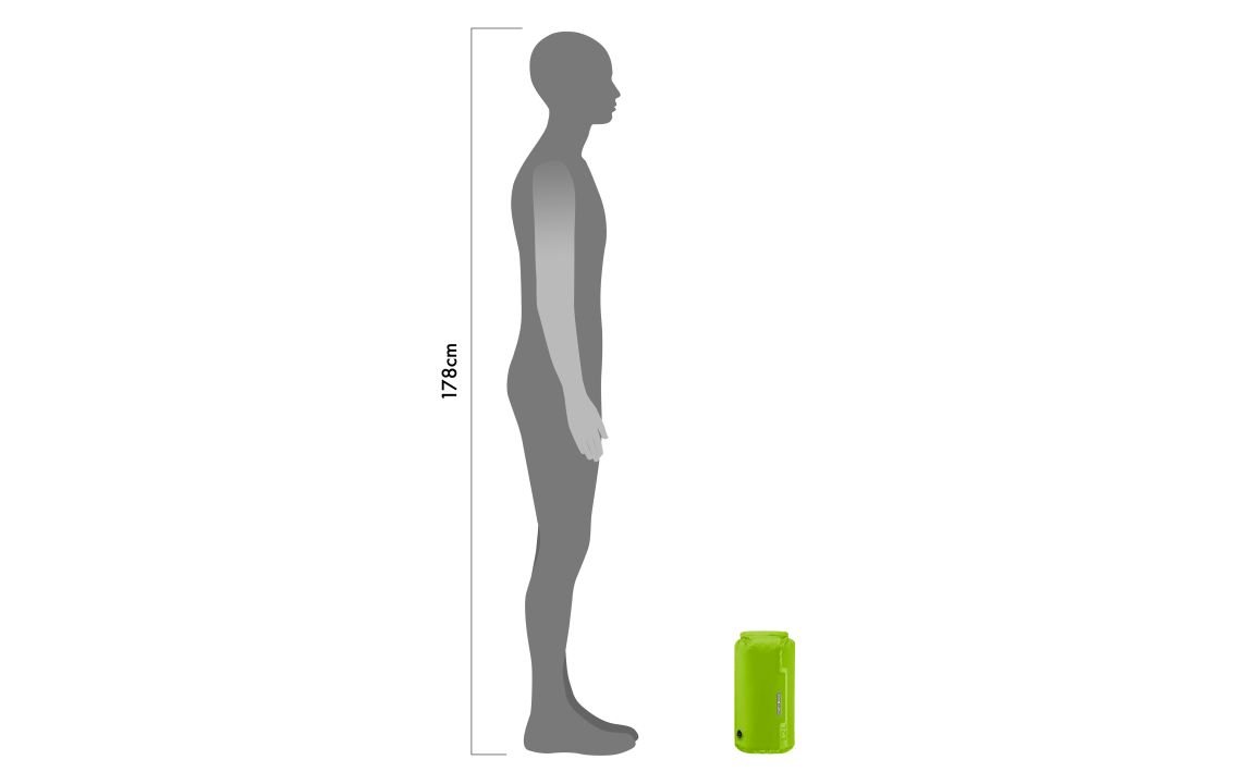 With valve for deflation – particularly suited for compressing sleeping bags, height 32 cm, diameter 21.5 cm, capacity 12 l, weight 74 g, IP64, PU-coated Nylon