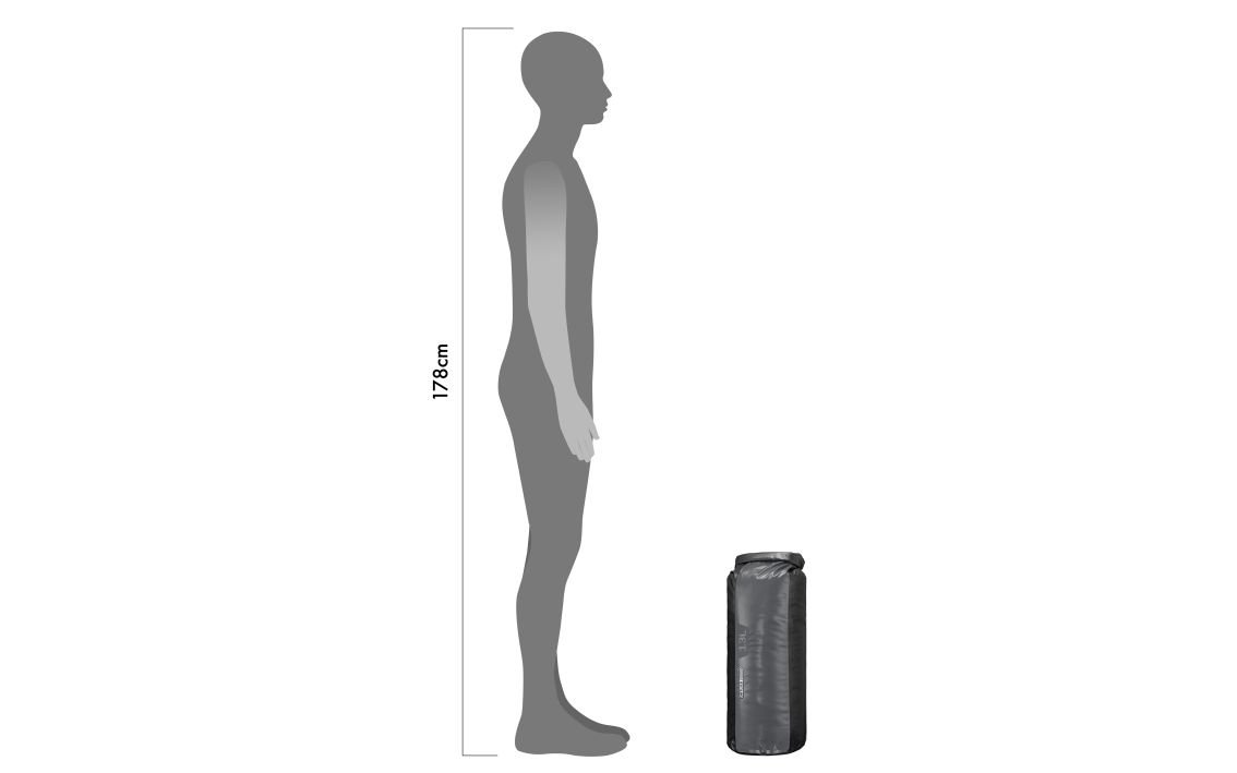 Proven roll closure and single stiffener bar ensure absolute waterproofness, protection and optimal packing volume. A reinforced base provides stability and easier loading. Height 42 cm, diameter 19 cm, 13 l capacity, weight 220 g, IP64, PVC-coated polyester