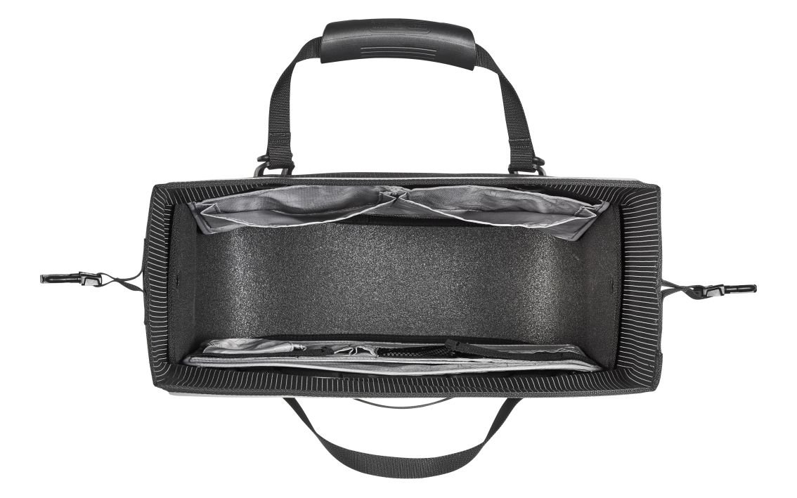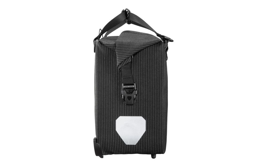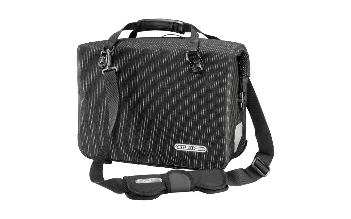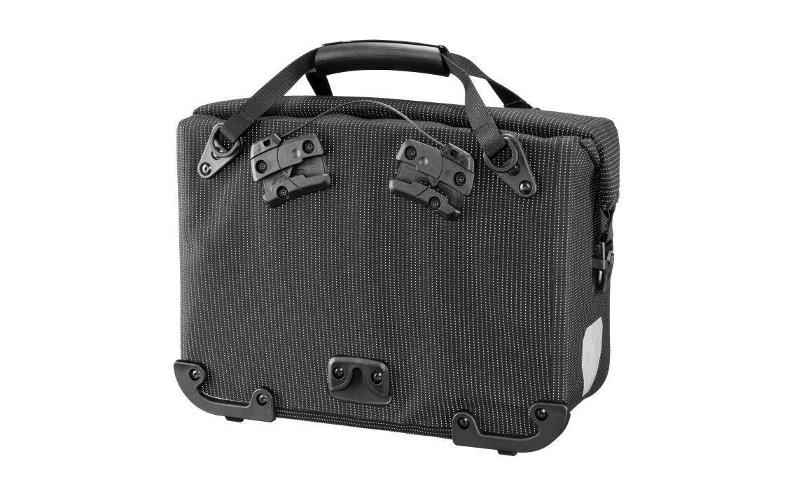 The ORTLIEB High Visibility Line enhances safety by significantly improving visibility in traffic. Made from PU-laminated black Cordura fabric woven with highly reflective yarn, the entire bag acts as a reflector in the dark—providing increased visibility at night while maintaining an elegant black appearance during the day.
