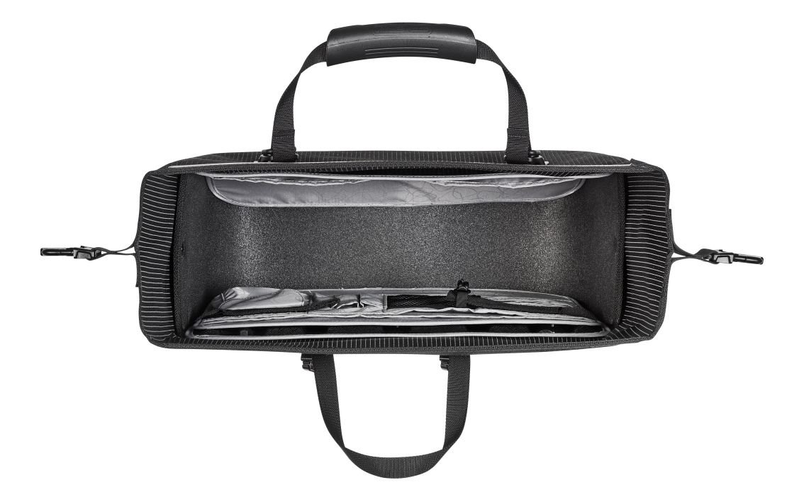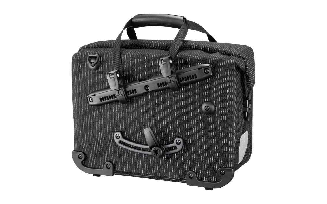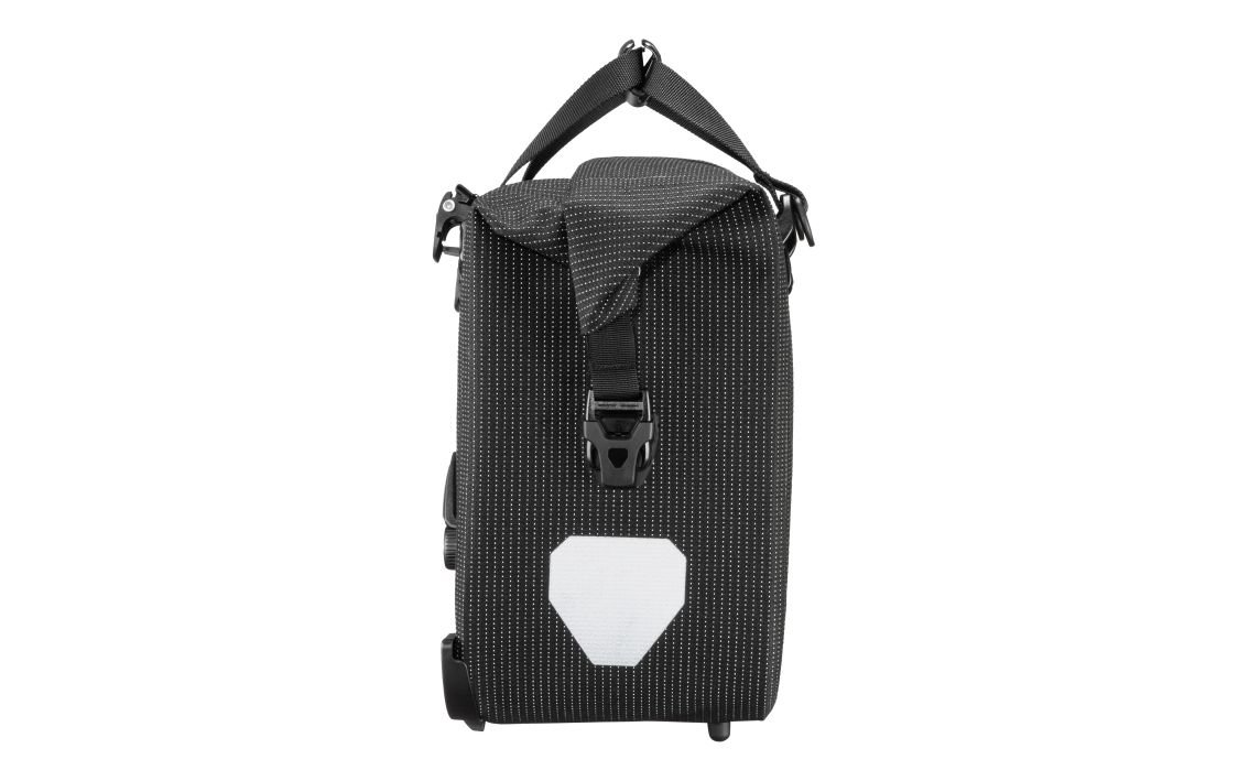 The ORTLIEB High Visibility Line enhances safety by significantly improving visibility in traffic. Made from PU-laminated black Cordura fabric woven with highly reflective yarn, the entire bag acts as a reflector in the dark—providing increased visibility at night while maintaining an elegant black look during the day.