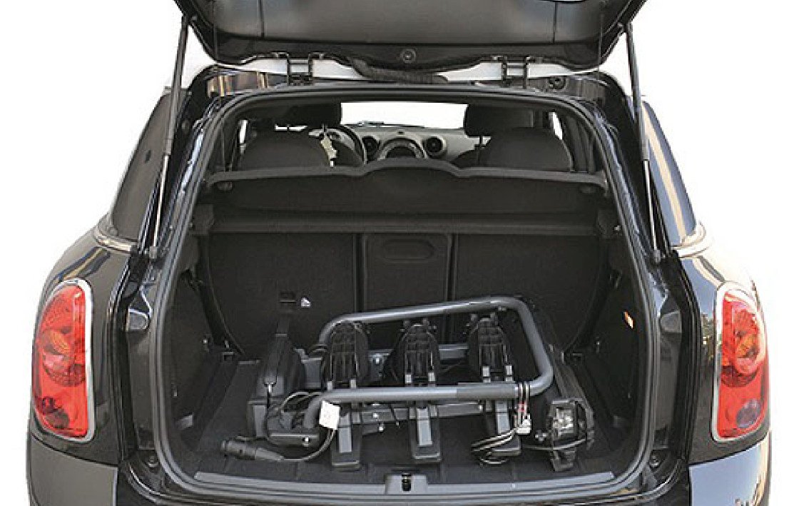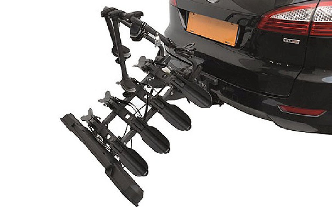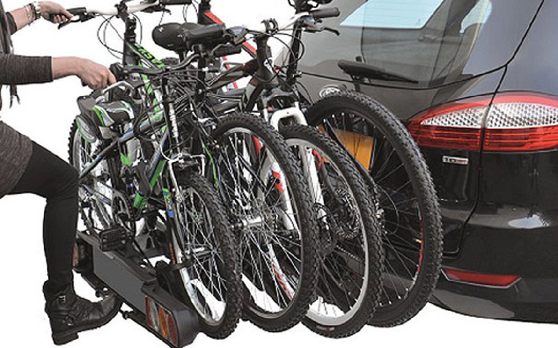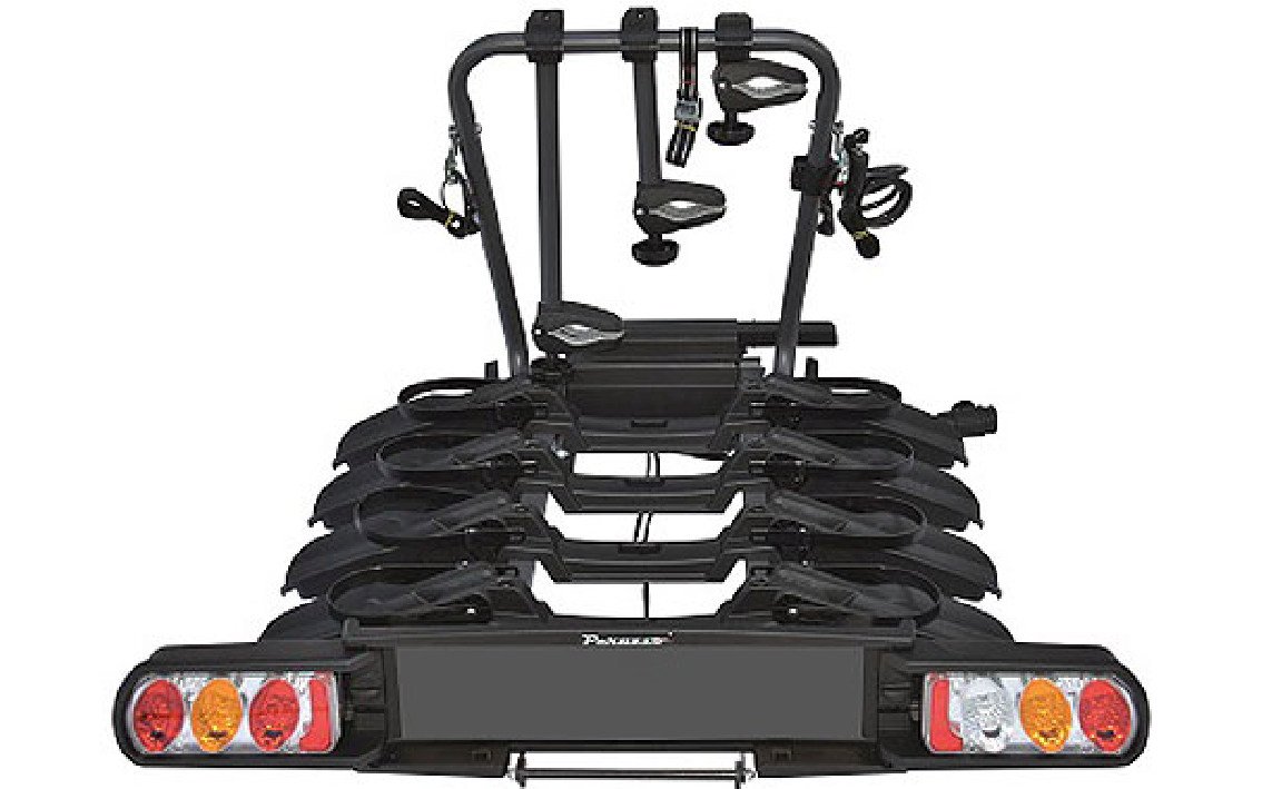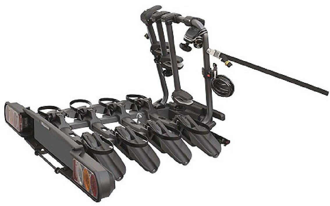 steel, for use with towball, 4 bikes 29″, max load 4×15 kg, quick and easy to fit and remove, patented shock absorbon frame support, safety strap fixed to cycle carrier, complete with homologated rear light bar and 13 pin plug, 19 kg