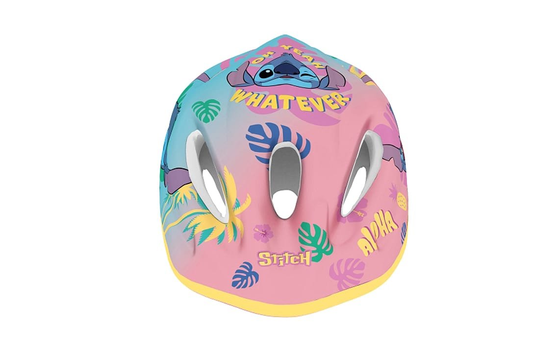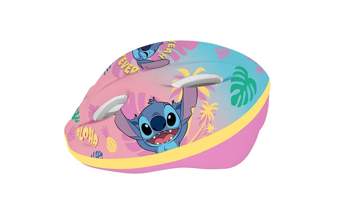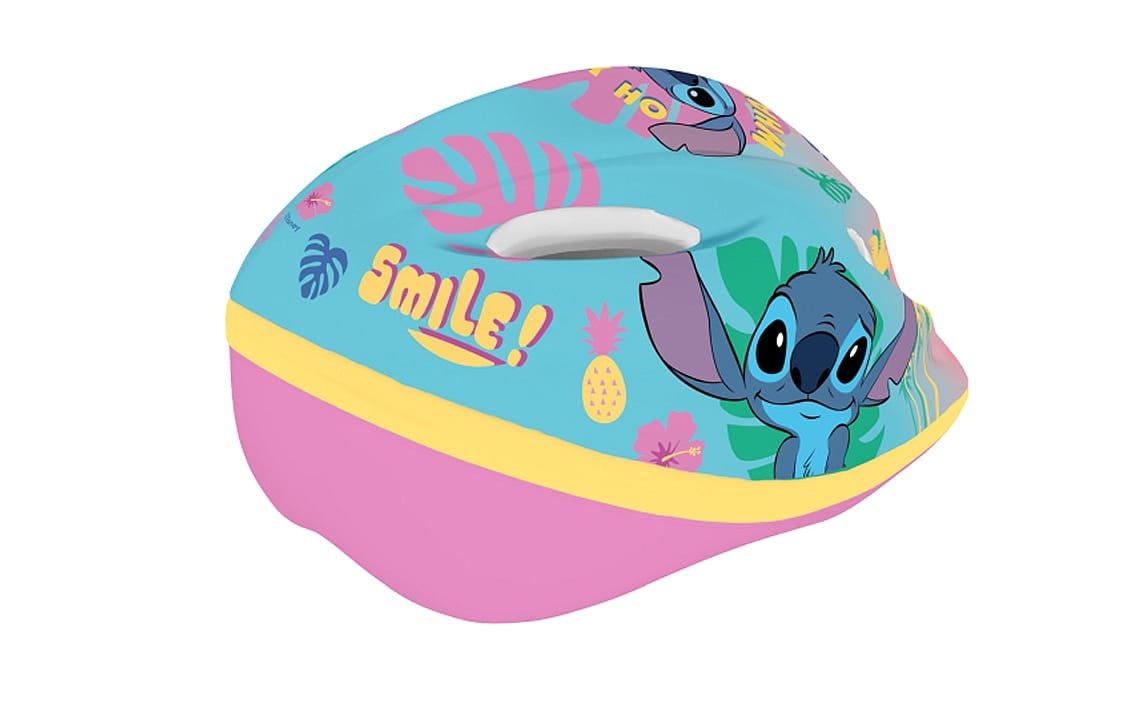 Helmet is recommended for kids while using bikes, skates, scooters, etc. Outside helmet is made of PVC and decorated with characters from Stitch, Inside is made of the impact absorbing EPS foam. Helmet is equipped with adjusting knob to adjust the helmet to the baby’s head, straps on both sides clipped under chin with a buckle with a soft pad. There are ventilation holes in the shell of the helmet.