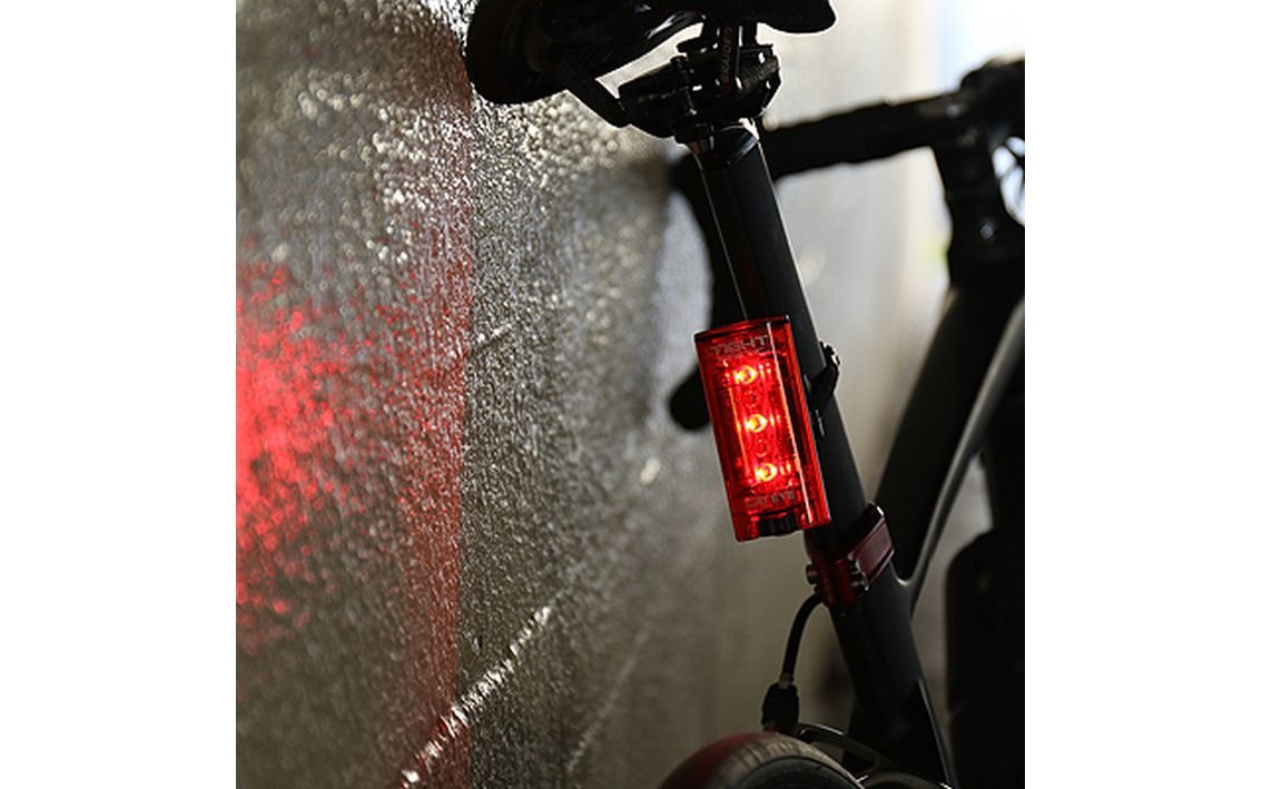 Long running battery-powered rear light with high waterproof rating of IPX7. Built-in “Brake Mode” function will alert others behind you of your deceleration.