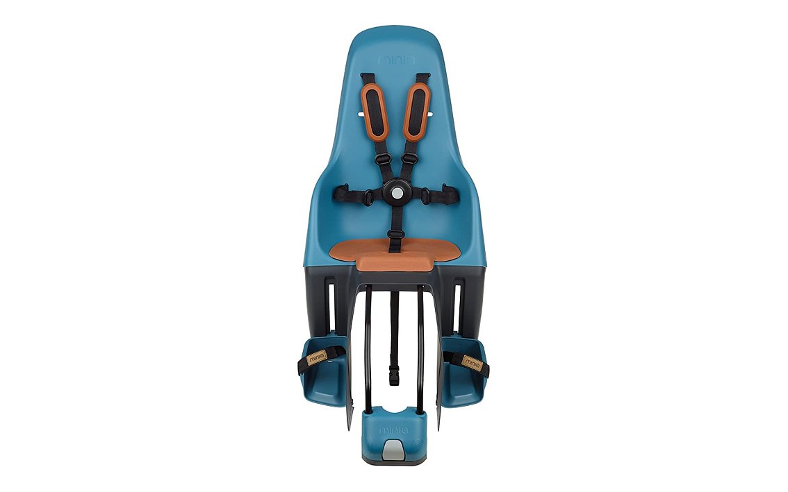 HARNESS SYSTEM: The harness consists of five straps (two shoulder straps, two side straps, and one bottom strap) that come together into a child-safe buckle that requires two hands to press buttons to open. The Minia’s built-in leg guards keep little legs safely away from the rear tire.