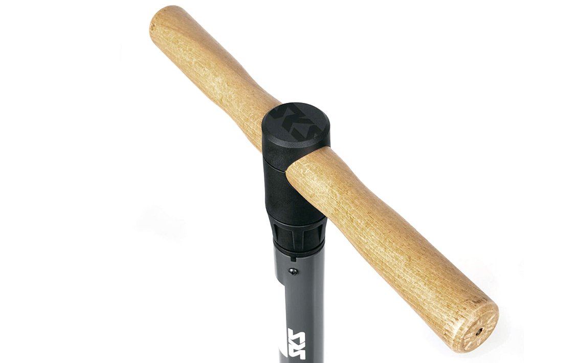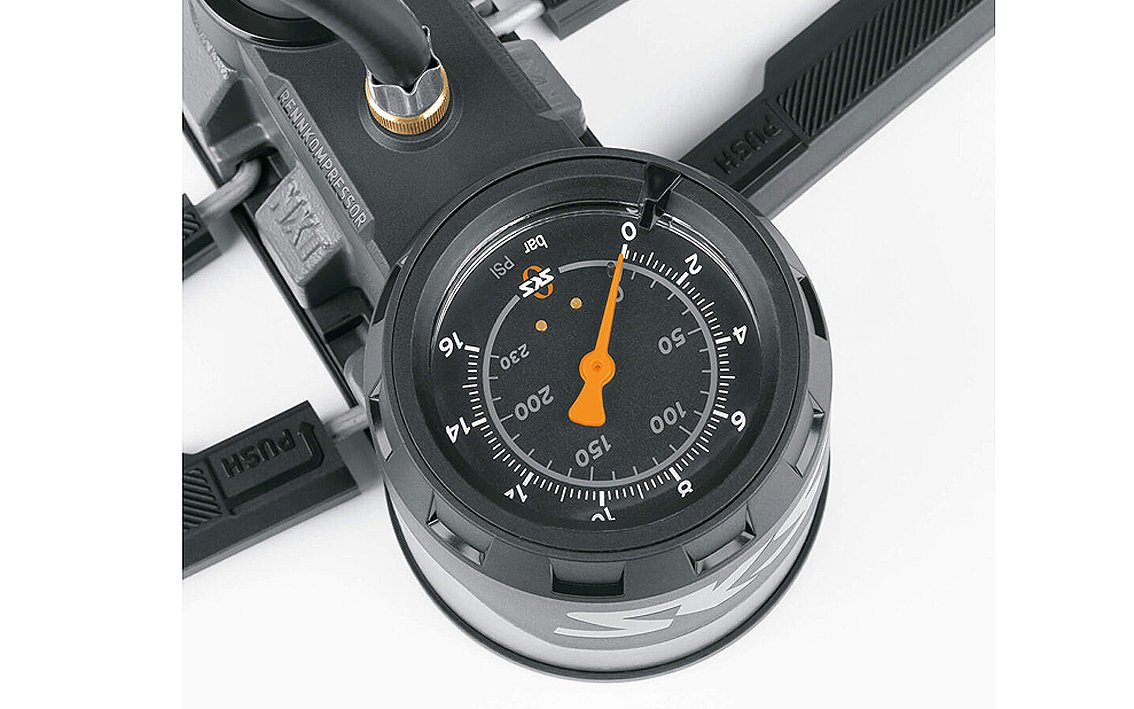 The SKS floor pump is equipped with the revised MV EASY MULTI VALVE valve head with innovative rocker technology. The beech wood handle sits comfortably in the hand and can be removed without tools for space-saving transport. With its robust appearance, the RENNKOMPRESSOR NXT remains true to the tool character of the original model. In contrast, the clean stealth design corresponds to the zeitgeist and is based on the SKS floor pump range.