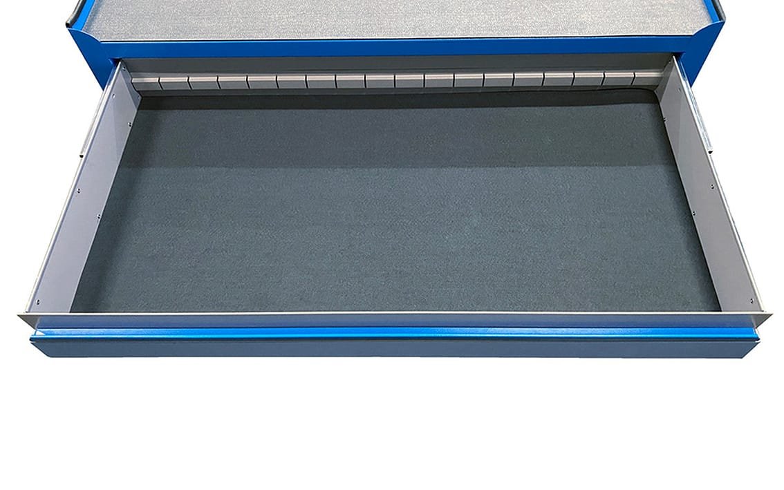 The increased depth of the top drawer enables to store all sockets, including long sockets, in an upright position. This gives maximum space efficiency and increases the number of tools that can be stored in the drawer compared to traditional shallow drawers. In an upright position can be stored all tools in larger dimensions till maximum height of 110mm.