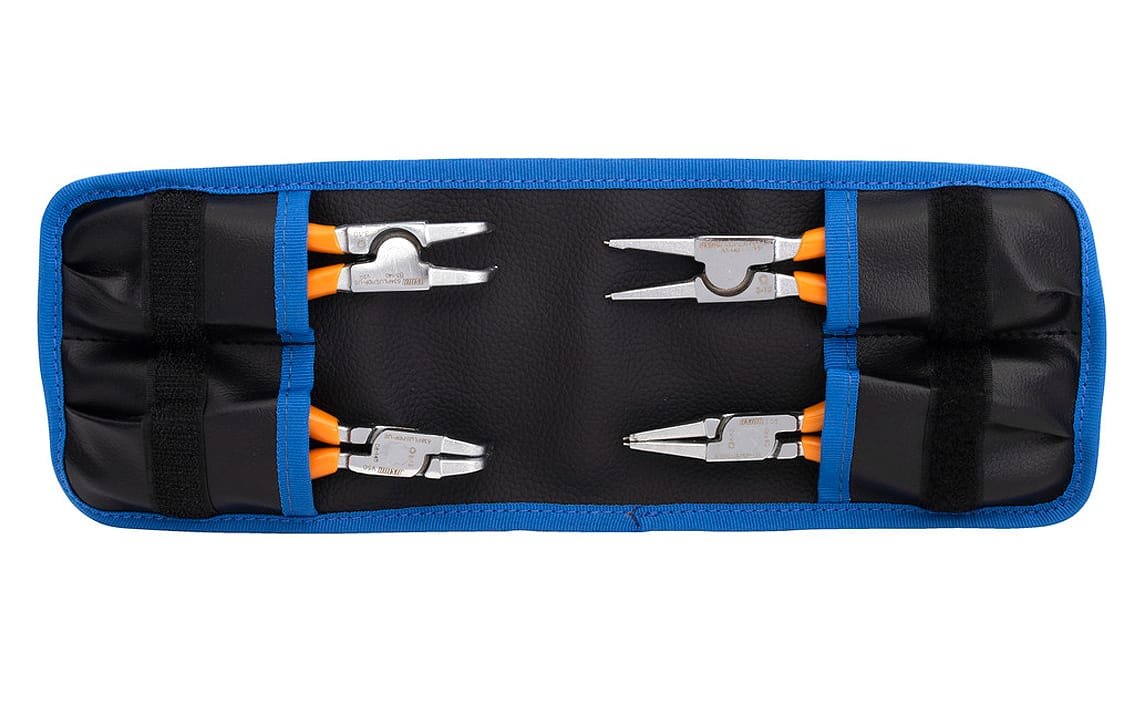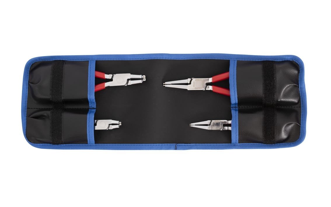 629819 – Bloķēšanas riņķu knaibles maisiņā, 4 gab. komplektā. Iekšējo bloķēšanas gredzenu knaibles, taisnas: 140×12 – 25, 180×19 – 60. Iekšējo bloķēšanas gredzenu knaibles, liektas: 140×12 – 25, 180×19 – 60.