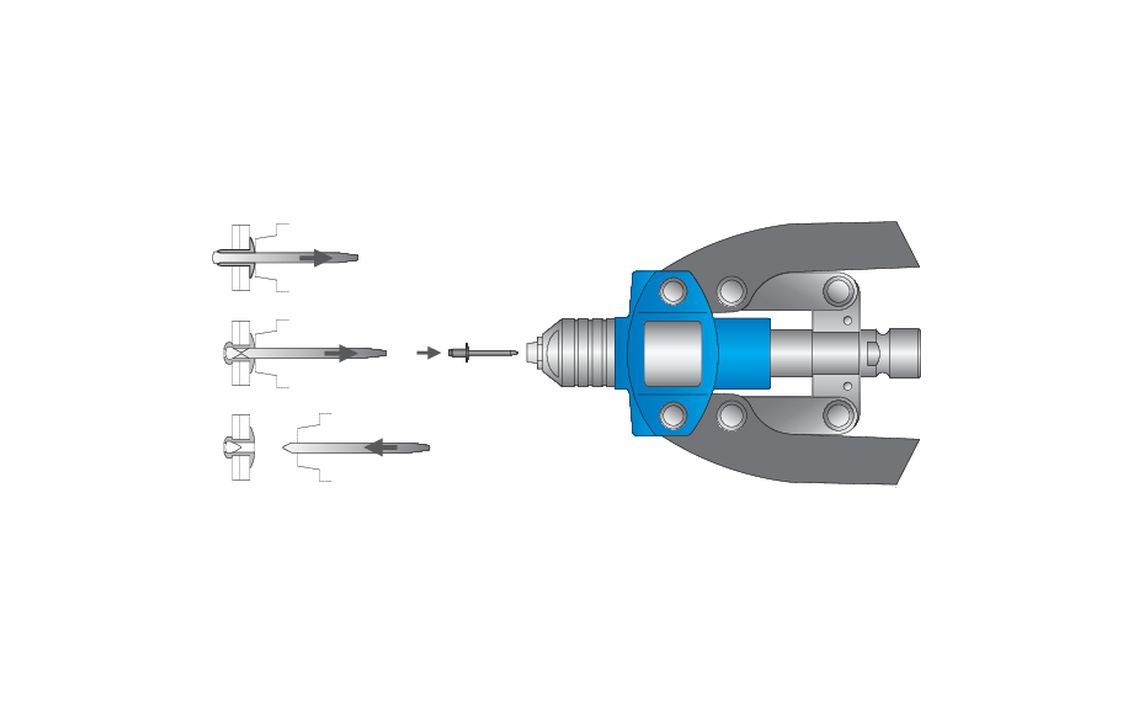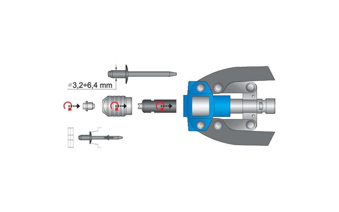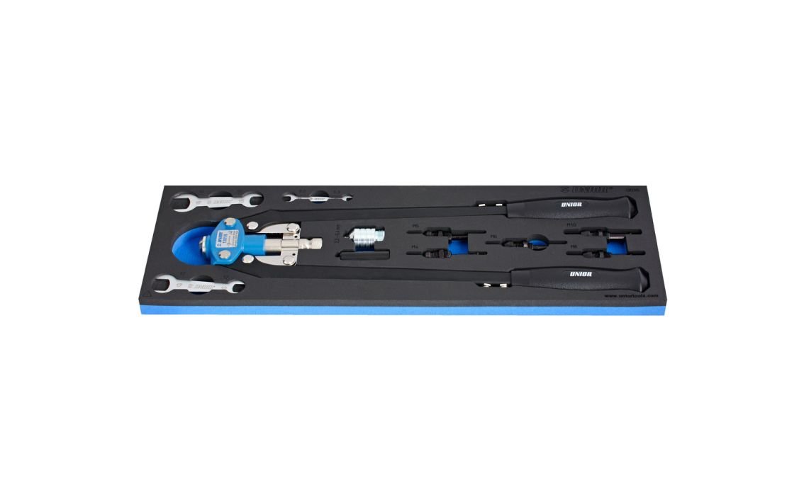 619880 – 5 nose pieces for installing rivets, 3.2 mm – 6.4 mm, 5 nosepieces for installing blind-rivet nuts, from M4 to M10; the tool comes with the SOS tool tray which can be used with Unior tool carriages