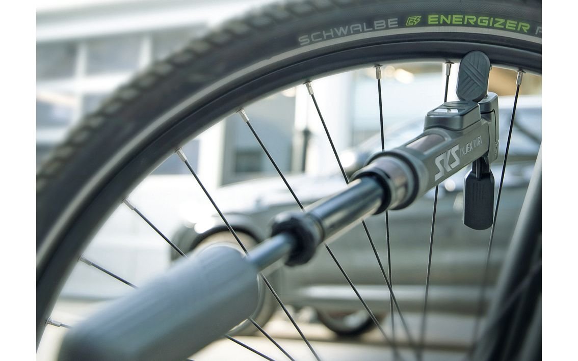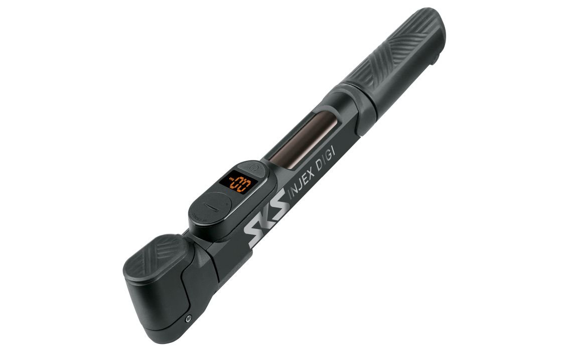 The INJEX DIGI is equipped with a digital, easy-to-read pressure gauge, enabling precise pressure measurements whilst out and about. It also features a textured two-component handle and an ergonomically coated compression tube. The T-handle is angled at 60 degrees so that the forearm and pump form a straight line during the pumping process. This ensures ergonomic and comfortable handling even with longer pumps. The pump head, with a 5-degree tilt, also makes it much easier to pump up tyres.