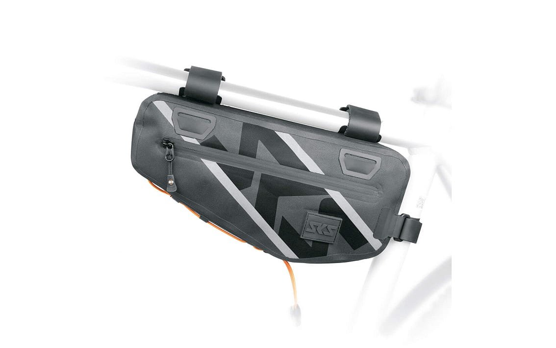 Thanks to the hook and loop fasteners with paint-friendly tube protection, the SKS frame bag can be flexibly adapted to the bike frame. The non-slip hook and loop fasteners are extra long, but can be easily shortened and replaced. The packing loop on the underside is particularly practical for mounting a mini pump, raincoat or muesli bar. Reflective stripes provide greater visibility even when out riding at dusk.