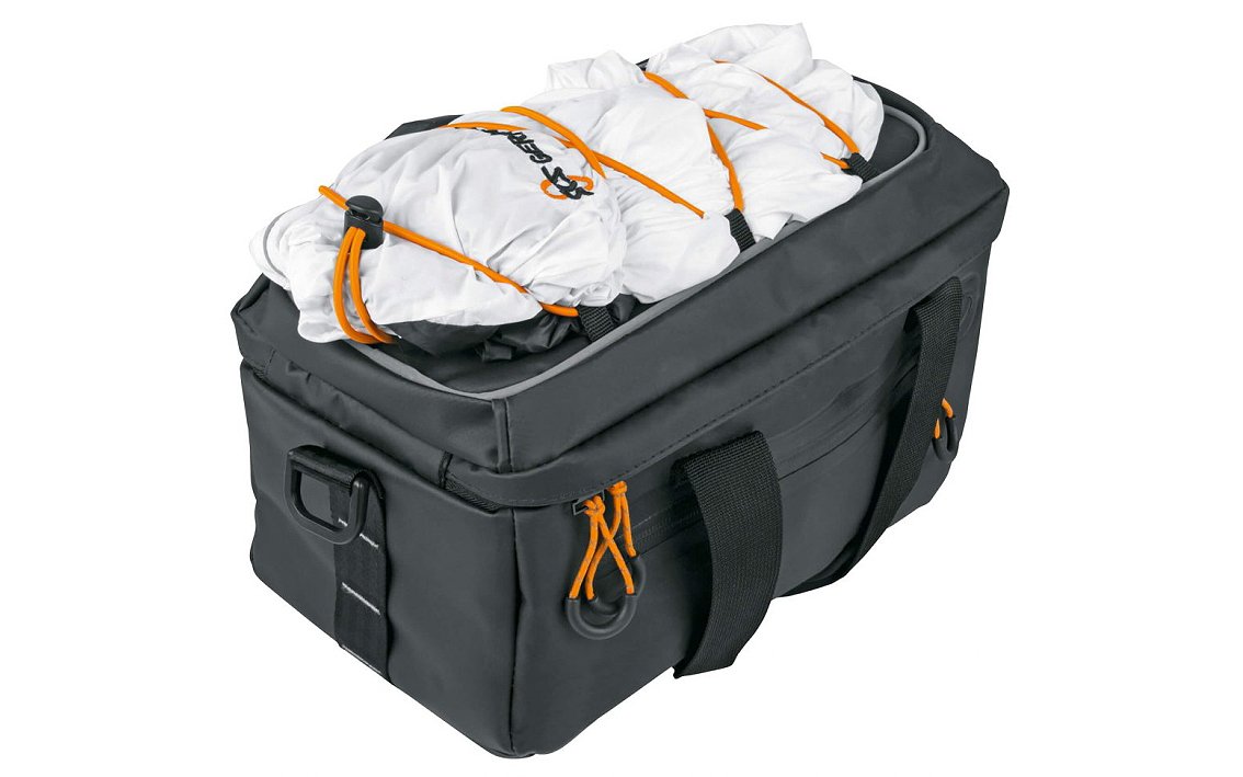 With a volume of 7 litres and a rubber mesh pocket, the INFINITY TOPBAG from the Basil brand offers plenty of storage space. The robust fabric is completely waterproof due to the glued seams. The large inner bag has a roll top closure and padded inner compartments additionally protect the contents. The bag is equipped with reflective elements and loops for mounting a rear light.