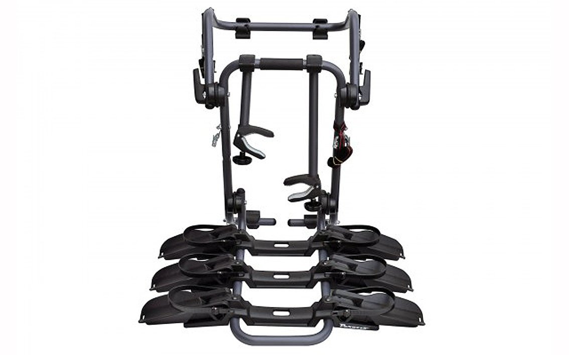 709/3 – tērauds, 3 velosipēdi, 29″ un FAT velosipēdiem, maksimālā 3 x 15 kg, dubultās augšējās siksnas, apakšējo siksnu pretsitiena sistēma, visas 6 siksnas pārbaudītas pa 300 kg, ātri un ērti montējamas un noņemamas, salokāmas vietas ietaupījums, 12.5 kg –