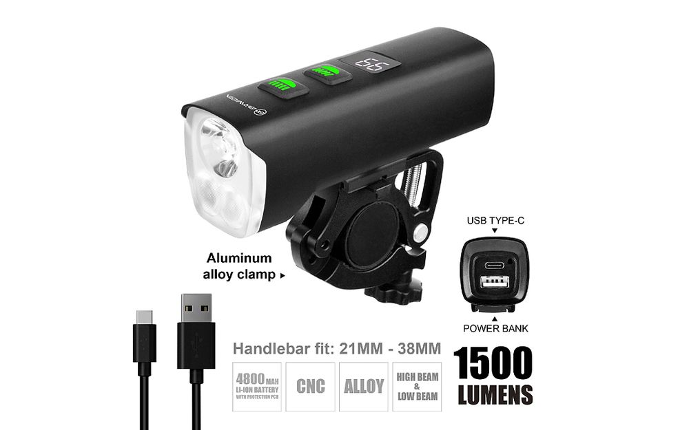 – 3 LED, 1500 lm, 4800 mAh Li-ion USB akumulators, USB-C pieslēgvieta, darbības laiks: 600 lm – 8 stundas, 300 lm – 15 stundas, 150 lm – 29 stundas, 300 lm mirgojošs režīms – 28 stundas, SOS režīms – 300 lm 28 stundas, 1500 lm – 3,5 stundas, uzlādes laiks: 6 stundas, akumulatora taupīšanas režīms, režīma atmiņas funkcija. Svars: 232 g. Ūdensizturības līmenis: IP65, Power bank, komplektā alumīnija sakausējuma kronšteins 22-38 mm stūrei –