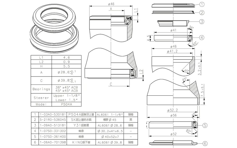 P504A-1-10FI00-B2A4 – 28.6-38.1 mm dakšai, 30.2 x 41.8 x 7; 40 x 52 x 7; bearing O.D. 41/52 mm, crown cone 39.8 mm, height 5.5 mm, ACB Bearing 45° x 45°, bezvītnes –