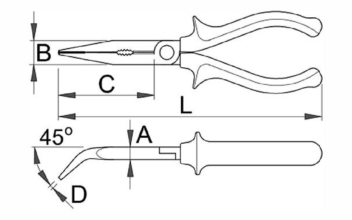 длина 170 мм, B: 17 мм, D: 2,5 мм, A: 9 мм, C: 77 мм, губки согнуты под углом 45°
